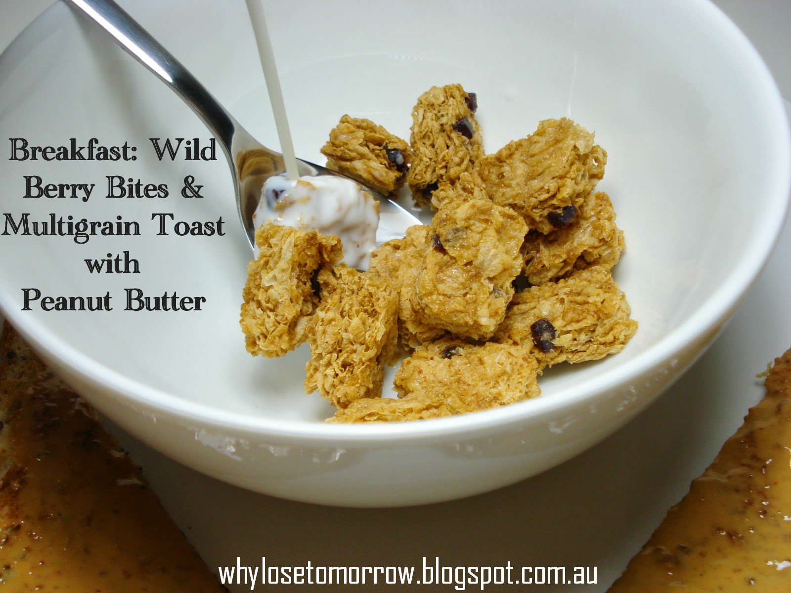 Breakfast: Berry Wheat Bites and Multigrain Toast with Peanut Butter